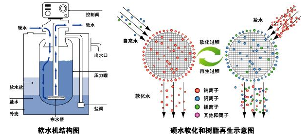 當(dāng)陽(yáng)離子交換樹(shù)脂吸收一定量的鈣Ca2+、鎂Mg2+離子之后,需要用鹽溶液浸泡并置換出去,以便恢復(fù)離子交換樹(shù)脂的吸附功能,此步為樹(shù)脂再生原理。